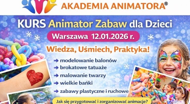 W odpowiedzi na to zapotrzebowanie 12 stycznia 2026 roku w Warszawie odbędzie się stacjonarny Kurs Animatora organizowany przez Akademię Animatora®. Szkolenie skierowane jest do osób, które chcą zdobyć konkretne umiejętności i przygotować się do pracy z dziećmi w praktyce.